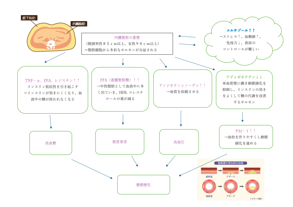 動脈硬化を起こしやすくする要因に、高血圧、脂質異常症、糖尿病などがありますが、この3つを引き起こしやすくするのが内臓脂肪です。